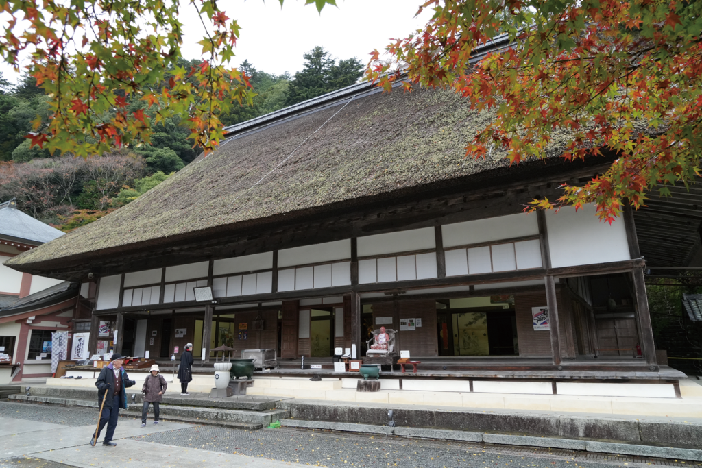 本堂は鎌倉時代の代表的な和様建造物として国宝に指定。例年11月頃には境内が鮮やかな紅葉に彩られ、とくに本堂周囲と庭園内の紅葉は「血染めのモミジ」と称されるほど深紅に染まる。