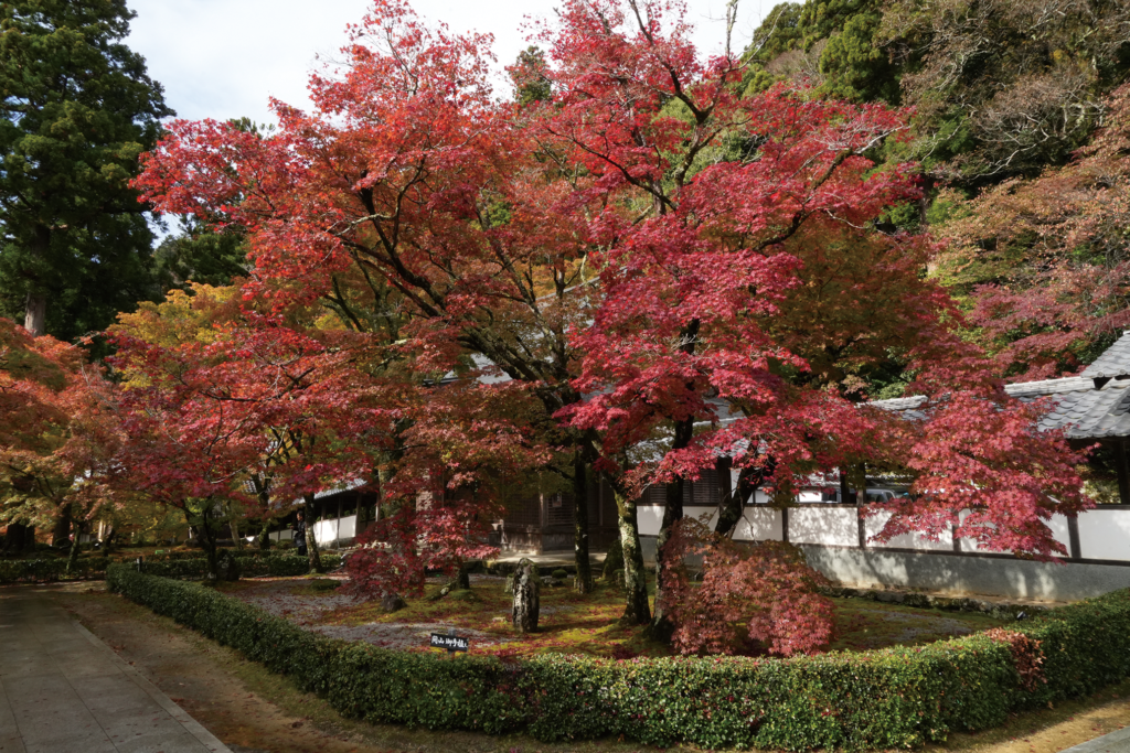 寂室(じゃくしつ)禅師が手ずから植えたもので、秋には重く深みのある赤色に。