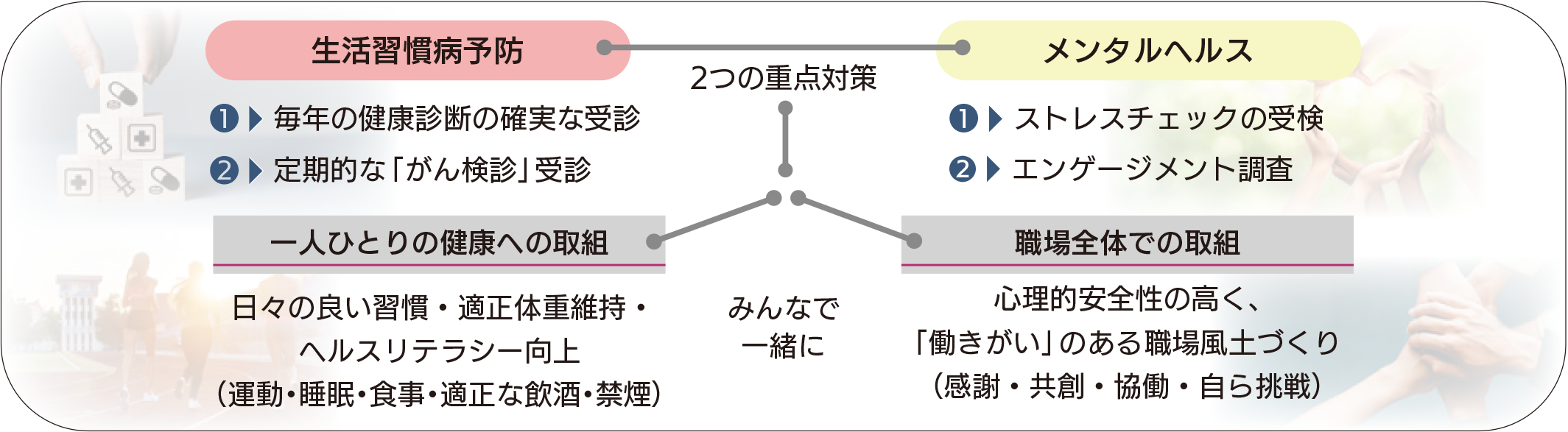 ● 会社・健康保険組合・労働組合は、引き続き一体となって、「生活習慣病予防」と「メンタルヘルス対策」の2つを柱とした健康維持・増進施策を通じた重症化予防、女性の健康、両立支援策に取り組みます。
