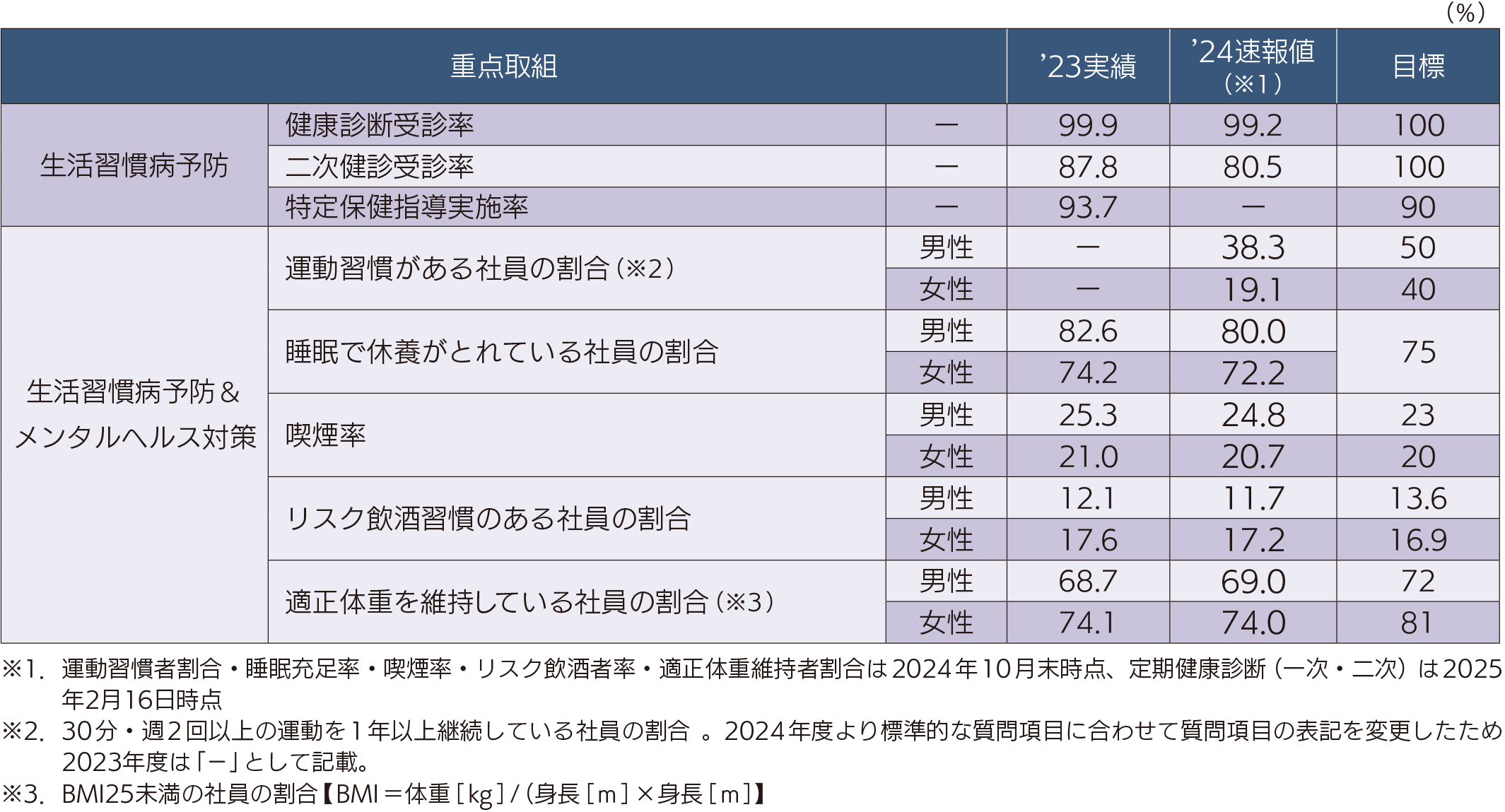 ● また、2024年には福利厚生サービス事業を中核とする株式会社ベネフィット・ワンがグループ会社に加わりました。同社の健診・特定保健指導等のヘルスケアサービスも活用しながら引続き健康増進に取り組んでいきます。