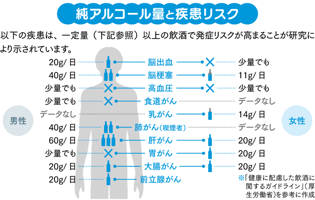 厚⽣労働省のガイドラインでは、健康リスクが⾼まる1⽇の純アルコール量は、男性で40g以上、⼥性で20g以上としています(ビール中瓶1本=約20g)。