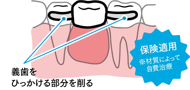 金属製のワイヤー(クラスプ)を隣接する歯にかけて固定します。歯を削る部分はブリッジより少なくてすみますが、噛み心地は劣ります。