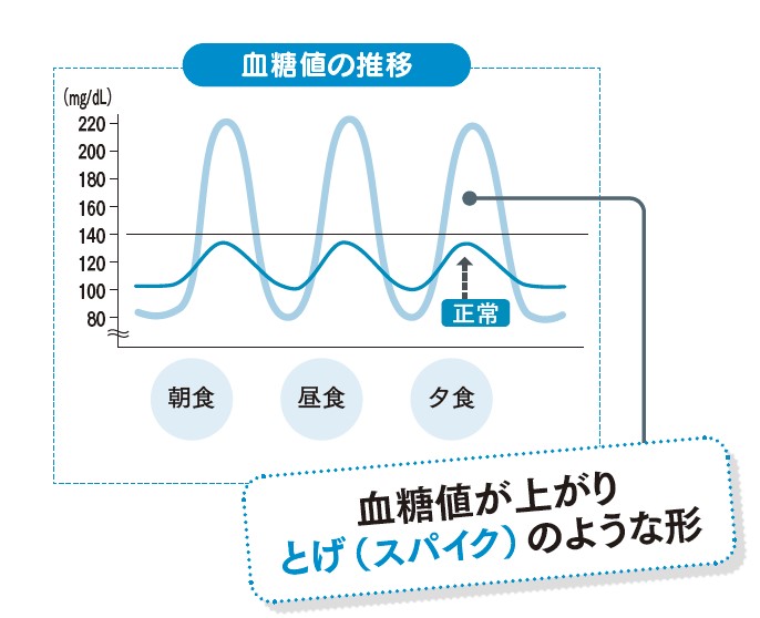 食後に血糖値が急上昇・急降下すること。インスリンの働きや出方が悪いと、こうした血糖値の乱高下が起こり、血管にダメージを与えます。とくに糖質・炭水化物の多い食事で起こりやすくなります。