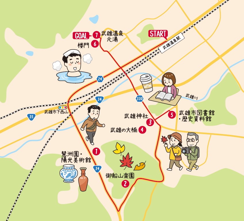 武雄神社前の県道330号に戻ったら、ゴールの武雄温泉をめざす。鮮やかな色彩が竜宮城を思わせる楼門をくぐったら、温泉に到着だ。ウオーキングで疲れた体を、歴史ある出湯でしっかり癒そう。