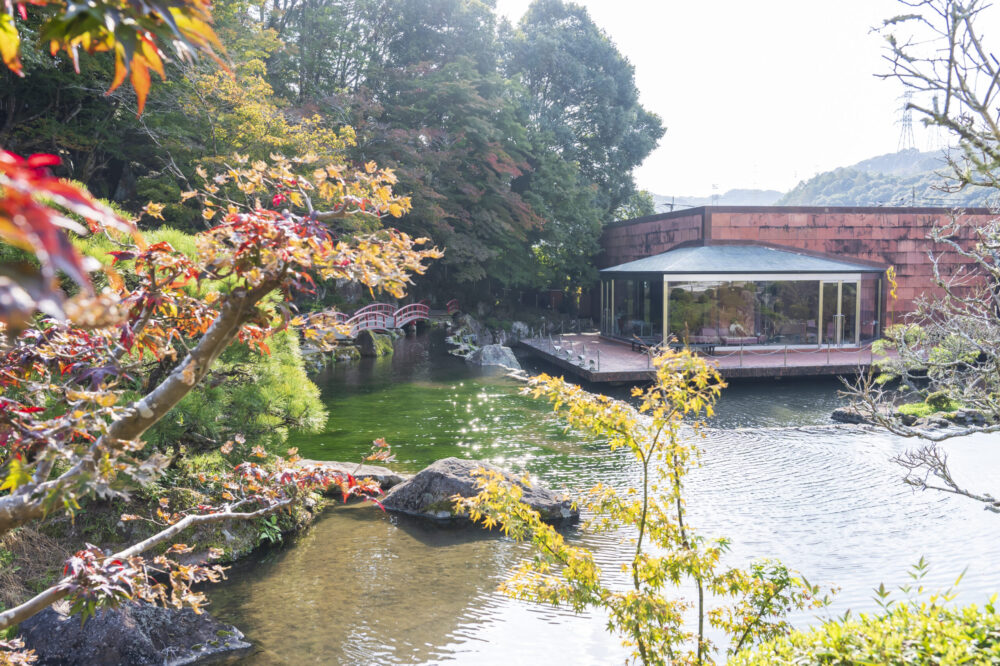 ンボルともいえる御船山の断崖を借景に庭園の木々が紅葉する様子は、まさに楽園のような美しさだ。高低差のある園内を、景色を眺めながら散策するのも楽しい。