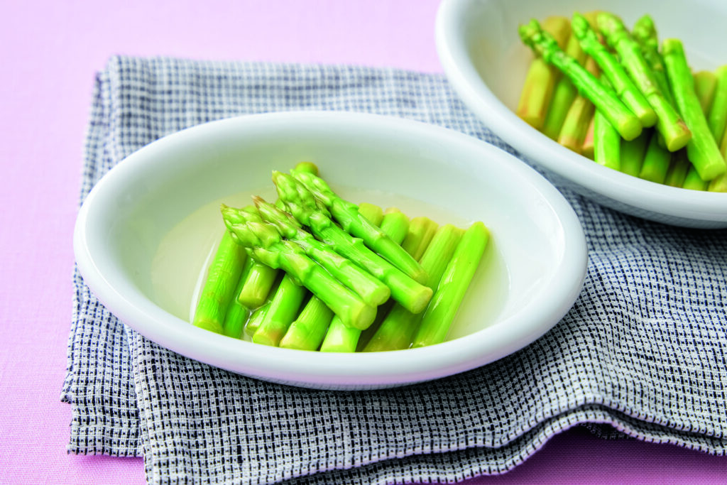 - アスパラガスは下方の硬い部分をピーラーで削り、3〜4等分に切る。水でサッと表面を濡らして耐熱ボウルに入れ、ラップをかけて電子レンジ(600W)で2分温める。