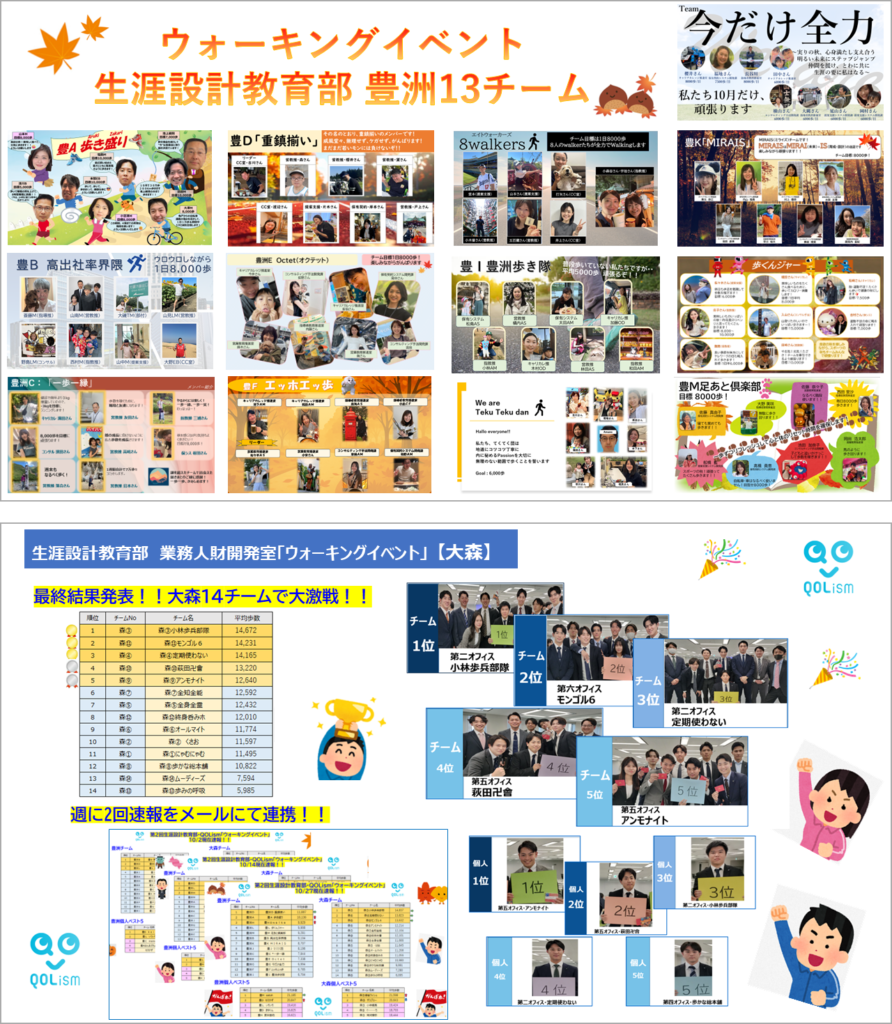 生涯設計教育部ウォーキングイベント(豊洲・大森合同)豊洲13チーム・大森14チームの計27チームで競い合います。目標は各チームにて設定。